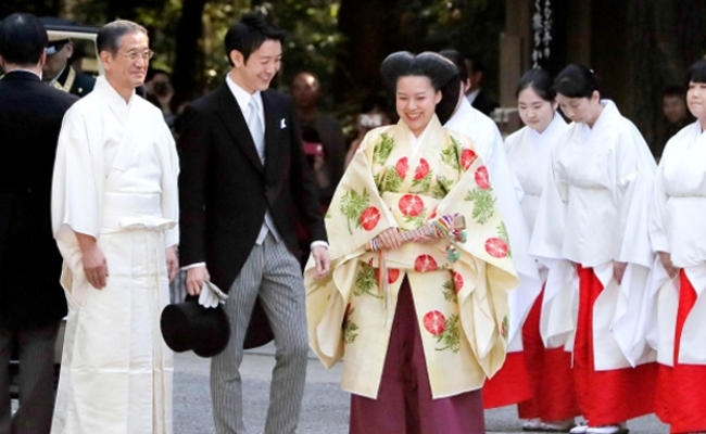 उन्होंने प्रमुख शिपिंग कंपनी निपन युसेन में काम करने वाले 32 वर्षीय केई मोरिया से विवाह किया है. राष्ट्रीय समाचार में जोड़े को सोमवार सुबह मंदिर में मेहमानों के बीच जाते दिखाया गया.