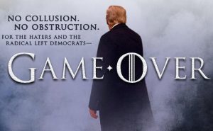 वाशिंगटन : अमेरिका के राष्ट्रपति डोनाल्ड ट्रंप ने विशेष अधिवक्ता रॉबर्ट मूलर की जांच में अपने खिलाफ कुछ साबित नहीं होने पर एचबीओ की मशहूर फंतासी सीरीज ‘गेम ऑफ थ्रोन्स’ के स्टाइल में फिर एक पोस्टर जारी किया. उन्होंने ट्वीट कर कहा, ‘गेम ओवर’.