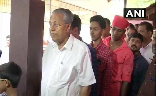 Kerala: CM P. Vijayan queues up to casts his vote at polling booth in RC Amala Basic UP School in Pinarayi in Kannur district. #LokSabhaElections2019 pic.twitter.com/LLydBK4FcN