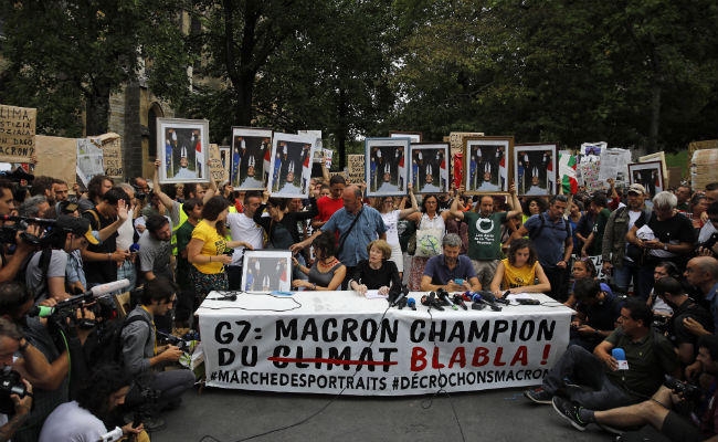 प्रदर्शनकारियों ने बेयोन शहर के निकट बियारिट्ज रिजॉर्ट में मार्च निकाला, जहां विश्व के नेता जी-7 सम्मेलन के लिए एकत्रित हो रहे हैं. प्रदर्शन का आयोजन पर्यावरणीय कार्यकर्ता समूह ‘एएनवी सीओपी 21’ और दो अन्य समूहों ने किया. इस दौरान प्रदर्शनकारियों ने मैक्रों के इस्तीफे की मांग की. राष्ट्रपति एमेनुएल मैक्रों के छायाचित्र थामे प्रदर्शनकारियों ने उनकी नीतियों की आलोचना करते हुए नारेबाजी की. पुलिस ने कहा कि इससे पहले शनिवार को जब सम्मेलन शुरू हुआ तो 9 हजार से अधिकर प्रदर्शनकारियों ने फ्रांस और स्पेन को जोड़ने वाले एक पुल पर जी-7 विरोधी मार्च निकाला, जिन्हें तितर-बितर करने के लियए पुलिस को आंसू गैस के गोलों का इस्तेमाल करना पड़ा.