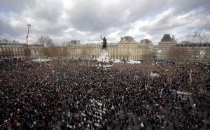 आतंकवाद के खिलाफ ऐतिहासिक रूप से नाराजगी व एकजुटता दिखाने के लिए पेरिस की सड़कांे पर निकले शांति मार्च में 10 लाख से अधिक लोग और दर्जनों अंतरराष्ट्रीय नेता शामिल हुए. ‘सिटी ऑफ लाइट’ में भावनाओं का ज्वार उमड़ा. अलग-अलग क्षेत्रों के कई लोगों की आंखों में आंसू छलक उठे और वे ‘अभिव्यक्ति की स्वतंत्रता’ के बैनर तले एक साथ आये. एकजुटता के इस अभूतपूर्व प्रदर्शन में इस्राइल के प्रधानमंत्री बेंजामिन नेतन्याहू और फिलीस्तीन के राष्ट्रपति महमूद अब्बास, जॉर्डन के शाह तथा महारानी के अलावा जर्मन चांसलर एंजेला मर्केल तथा ब्रिटिश प्रधानमंत्री डेविड कैमरून सहित अन्य शीर्ष यूरोपीय नेताओं ने मार्च में शिरकत की. अमेरिका के राष्ट्रपति बराक ओबामा का प्रतिनिधित्व अटॉर्नी जनरल एरिक होल्डर ने किया. फ्रांस के राष्ट्रपति फ्रांस्वा ओलांद ने पीड़ितों को श्रद्धांजलि का नेतृत्व किया.