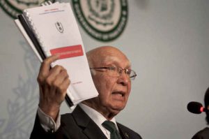 सरताज अजीज ने यह भी कहा कि वे तीन डोजियर लेकर भारत जायेंगे और उसे सौंपेगे, जो रॉ से संबंधित है. अजीज ने आरोप लगाया कि पिछले दो महीने में भारत की ओर से 70 बार युद्ध विराम का उल्लंघन किया गया था.