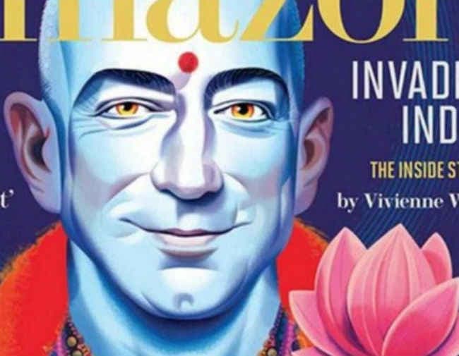 ‘फॉर्चून’ मैगजीन के जनवरी के इंटरनैशनल एडिशन में अमेजन के भारत में व्यापार बढ़ाने को लेकर एक कवर स्टोरी छापी गई है जिसमें अमेजन के सीईओ को विष्णु के अवतार में दिखाया है साथ ही उनके हाथ में कमल को भी प्रदर्शित किया है.