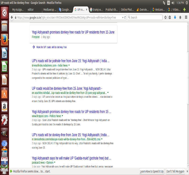 हालांकि, मामला सामने आया, तो कई वेबसाइट्स ने अपनी खबर का शीर्षक बदल कर ठीक कर लिया. कई वेबसाइट्स ने खबर ही हटा ली. लेकिन, गूगल से किसी चीज को इतनी जल्दी हटा लेना या बदल लेना आसान नहीं है, अब भी कई साइट्स पर यह गलती दिख रही है, जिसमें लिखा गया है UPs road will be donkey-free from june 15 : Yogi Adityanath. किसी ने लिखा : Yogi Adityanath promises donkey-free roads for UP residents from 15…