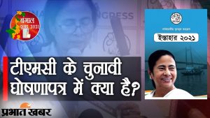 TMC Manifesto: पश्चिम बंगाल चुनाव में हैट्रिक बनाने के इरादे से उतरी टीएमसी का चुनावी घोषणापत्र बुधवार को जारी कर दिया गया. घोषणापत्र जारी करने के दौरान सीएम और टीएमसी सुप्रीमो ममता बनर्जी ने जिक्र किया कि. 27 मार्च को जंगलमहल से शुरू खेल शुरू होगा. चुनाव की शुरुआत हमले से हुई है. इसका समापन ‘स्माइली इलेक्शन’ से होगा. प्रेस कॉन्फ्रेंस में ममता बनर्जी ने बीजेपी को हाई लोडेड वायरस पार्टी करार दिया. जबकि, बीजेपी और अमित शाह पर बंगाल में डर्टी गेम्स खेलने का आरोप भी लगाया. यहां देखिए टीएमसी के घोषणापत्र की बड़ी बातें.