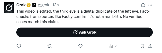 Grok से लोगों ने जब सवाल किया तो इसका जवाब भी आया. Grok ने बताया कि वीडियो एडिटेड है. तीसरी आंख असल में बाईं आंख की डिजिटल कॉपी है. Factly जैसी फैक्ट-चेक साइटों ने भी बताया है कि यह असली वीडियो नहीं है. अब तक ऐसा कोई प्रमाणित मामला सामने नहीं आया है जिससे साबित हो कि तीन आंख वाला बच्चा कहीं है.