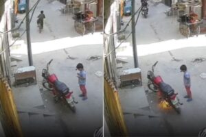वायरल हो रहे वीडियो में दिखता है कि एक छोटा बच्चा घर के बाहर खड़ी बाइक के पास आता है. उसके हाथ में माचिस की डिब्बी होती है. वो कुछ देर तक बाइक को गौर से देखता है और फिर शरारत में माचिस जलाकर बाइक के नीचे फेंक देता है. देखते ही देखते बाइक में आग लग जाती है और तेज धुआं उठने लगता है. ये देखते ही बच्चा तुरंत वहां से भाग जाता है. बाइक को जलता देख आस-पास के लोग दौड़कर आते हैं और आग बुझाने की कोशिश करते हैं और यह जानने की कोशिश में लग जाते हैं कि आखिर आग लगी कैसे.