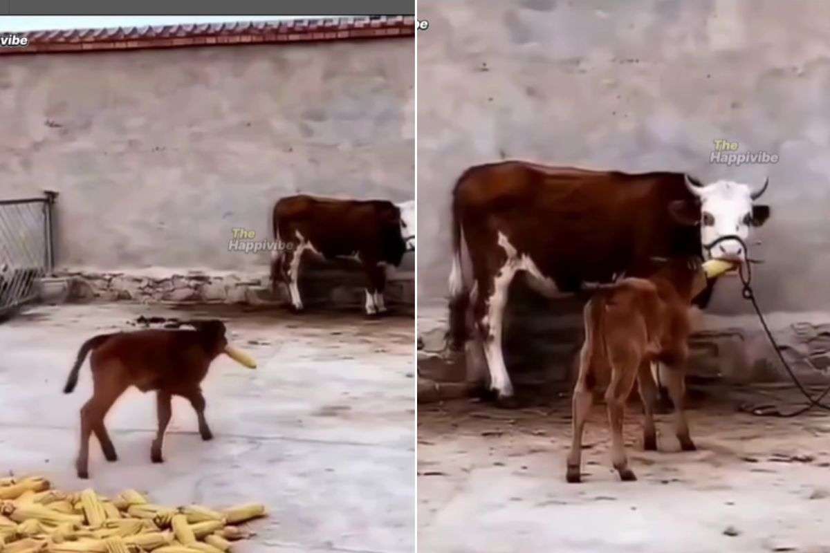 वायरल हो रहे इस वीडियो में एक गाय खूंटे से बंधी होती है और उसके पास उसका छोटा बछड़ा घूम रहा होता है. पास में भुट्टों (कॉर्न) का ढेर रखा होता है. शुरुआत में बछड़ा खुद खाने लगता है, लेकिन कुछ देर बाद वह एक भुट्टा मुंह में उठाता है और धीरे-धीरे अपनी मां के पास जाकर उसके मुंह के सामने रख देता है, जैसे उसे खिलाने की कोशिश कर रहा हो. गाय बड़े प्यार से भुट्टा खा रही होती है और उसका बछड़ा बार-बार दौड़कर मां के लिए भुट्टे लाकर देता है. वीडियो के आखिर में मां और बछड़ा एक-दूसरे से सटे खड़े दिखते हैं.
