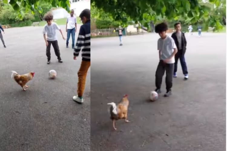 मुर्गे को फुटबॉल खेलते देख लोग हुए हैरान