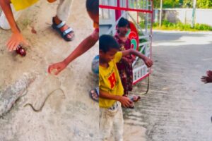 सोशल मीडिया पर वायरल हो रहे वीडियो में दिख रहा है कि एक बच्चा प्लास्टिक की बोतल में सांप को बंद करने की कोशिश कर रहा है. वो कई बार सांप को बोतल में डालने की कोशिश करता दिख रहा है. इसी दौरान उसके बगल में खड़ा दूसरा बच्चा सांप को पूंछ से पकड़कर उठा लेता है. दोनों बच्चे बारी-बारी से सांप को अपने हाथ में उठाते हैं. वीडियो में दिखाई दे रहा है कि बच्चों ने आखिरकार सांप को बोतल में बंद कर दिया. हालांकि, यह काफी खतरनाक था, क्योंकि सांप काफी डरा हुआ था और ऐसे में वो हमला भी कर सकता था.