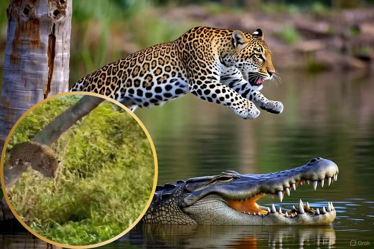 Viral Video: जंगल और जंगली जानवरों का वीडियो अक्सर सोशल मीडिया पर वायरल होता रहता है. ऐसा ही एक वीडियो तेजी से ट्रेंड कर रहा है. वीडियो में दिख रहा है कि एक तेंदुआ शिकार करने के लिए पेड़ से पानी में छलांग लगाता है. नपे तुले कदमों और सधे हुआ निशाना लगाकर वो सीधा मगरमच्छ को अपनी पकड़ में ले लेता है. किसी सिनेमाई दृश्य की तरह यह नजारा रोमांचित करने वाला है. खतरनाक तेंदुआ सधी हुई छलांग लगाकर मगरमच्छ को पकड़कर अपना निवाला बनाने की कोशिश करता है.