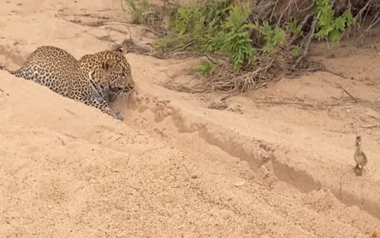 इस वीडियो में देखा जा रहा है कि कैसे एक छोटी सी चिड़िया तेंदुए के बिल्कुल पास पहुंच जाती है. ठीक ऐसा लगता है जैसे शिकार खुद शिकारी के मुंह में जा रहा हो. तेंदुआ शिकार करने को बिल्कुल तैयार होता है और तभी चिड़ियां को समझ आ जाता है और वो भागने लगती है. इसके बाद तेंदुआ भी अपने शिकार के पीछे पागलों की तरह पड़ जाता है. भागते हुए चिड़िया रेत में छिप जाती है और तेंदुआ उसकी तलाश में लग जाता है.