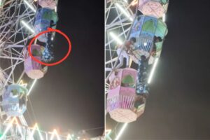 सोशल मीडिया पर एक मेले का वीडियो वायरल हो रहा है. दरअसल, मेले में लगे बड़े झूले (फेरिस व्हील) पर सवार एक महिला अचानक फिसलकर नीचे गिरने की स्थिति में हो जाती है. वह झूले की सीट से आधी बाहर लटकी हुई नजर आती है. उसी केबिन पर बैठे कुछ लोग उस महिला का हाथ पकड़े हुए रहते हैं. ये नजारा देख नीचे खड़े लोग टेंशन में आ जाते हैं और जोर-जोर से चिल्लाने लगते हैं.