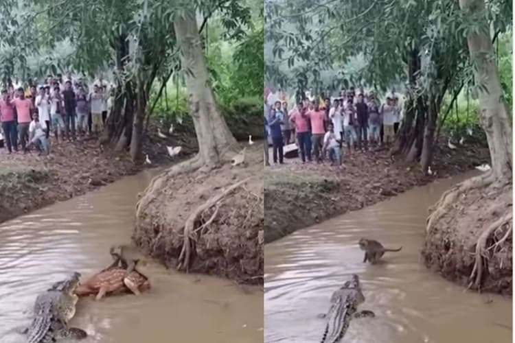 Viral Video: वायरल वीडियो में देखा जा सकता है, एक मगरमच्छ हिरण के सिर को अपने मजबूत जबड़े से जकड़ा हुआ नजर आ रहा है. हिरण को जान बचाने के लिए हाथ-पांव मारते हुए देखा जा सकता है. लेकिन मगरमच्छ की मजबूत पकड़ से खुद को नहीं बचा पाता. वीडियो में लोग भी नजर आ रहे हैं, लेकिन किसी ने भी उसकी मदद नहीं की. सिर्फ मोबाइल उठाकर यह नजारा रिकॉर्ड करते दिख रहे हैं. तभी एक नन्हे बंदर की एंट्री होती है और पूरा गेम ही बदल जाता है.