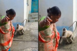 वीडियो में देखा जा सकता है कि कई सारे बंदर घर के बाहर आंगन में बैठे हुए हैं. तभी एक बुजुर्ग महिला आती है और उन्हें वहां से हटाने के लिए आवाज लगाती है, लेकिन बंदरों पर इसका कोई असर नहीं होता. इसके बाद जो महिला करती है, वह सबको हैरान कर देता है.