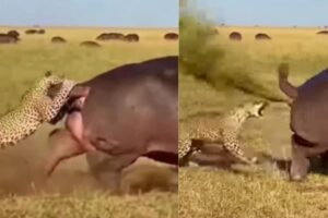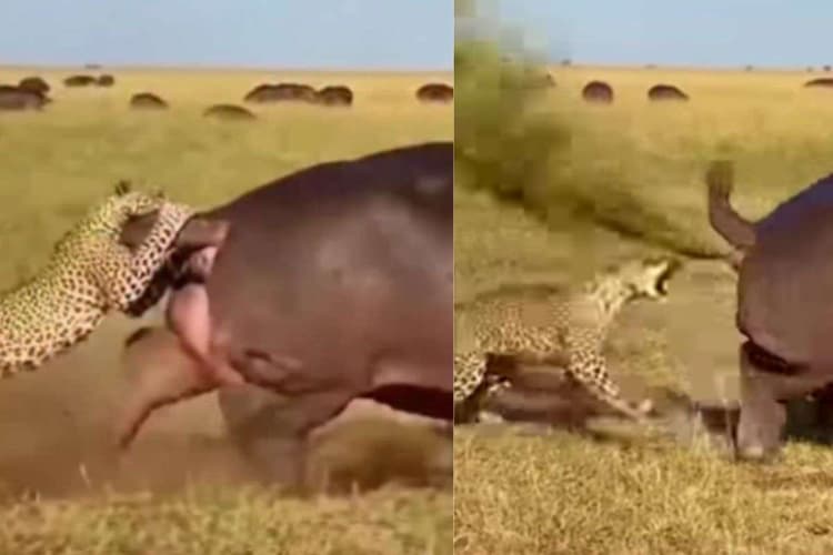 Viral Video: वीडियो में देखा जा सकता है कि तेंदुआ गैंडे पर हमला कर देता है और भागते हुए गैंडे की पूंछ को अपने मजबूत जबड़े से जकड़ लेता है. अपनी जान बचाने के लिए भाग रहे गैंडे ने अचानक रुककर एक ऐसा दांव खेला जिसकी तेंदुए को जरा भी उम्मीद नहीं थी. गैंडे ने तेजी से फार्ट (गैस) किया, जिससे हरे रंग का पदार्थ सीधा तेंदुए पर पड़ा और वह दूर जा गिरा. बेचारा तेंदुआ कुछ देर के लिए जमीन पर बेसुध पड़ा रहा. इस मौके का फायदा उठाकर गैंडा वहां से भाग निकला.