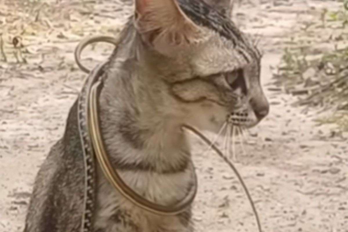 वायरल हो रहे वीडियो में दिख रहा है कि सांप बिल्ली के गले में लिपटा हुआ है. सांप बहुत ही पतला है. बिल्ली को समझ नहीं आ रहा है कि वह क्या करे. कई बार वह सांप को दांत से पकड़ने की कोशिश करती नजर आ रही है. बहुत कोशिश के बाद भी बिल्ली कामयाब नहीं होती. एक समय बिल्ली दांत से झपटा मारती है जिससे सांप डर जाता है. अंत में ऐसा लग रहा है कि सांप बिल्ली के शरीर से उतर जाता है.