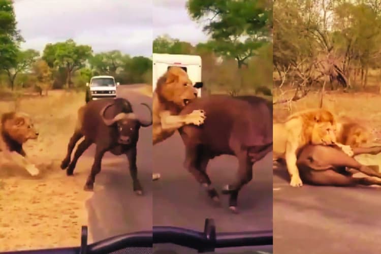 वायरल वीडियो में देखा जा सकता है एक शेर दो भैसों के पीछे भाग रहा है. भैंस भी अपनी जान बचा कर दौड़ रहे हैं. तभी एक भैंस हिम्मत दिखाता है और पलटकर शेर को डराने की कोशिश करता है. शेर कुछ देर के लिए भैंस से डर भी जाता है और अपने कदम पीछे लेता है. लेकिन, जैसे ही भैंस भागने की कोशिश करता है शेर उस पर झपट पड़ता है. इतने में ही पीछे से एक और शेर आता है और दोनों मिलकर भैंस को दबोच लेते हैं. भैंस थोड़ी देर तक छटपटाता है और चिल्लाता भी है, लेकिन फिर वह शांत हो जाता है.