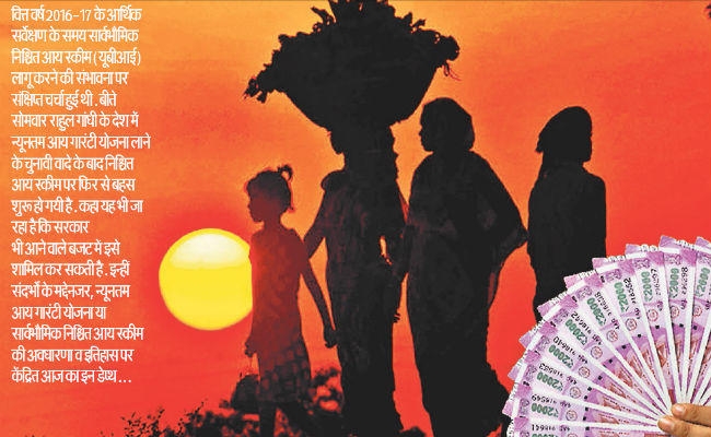 वित्त वर्ष 2016-17 के आर्थिक सर्वेक्षण के समय सार्वभौमिक निश्चित आय स्कीम (यूबीआई) लागू करने की संभावना पर संक्षिप्त चर्चा हुई थी. बीते सोमवार राहुल गांधी के देश में न्यूनतम आय गारंटी योजना लाने के चुनावी वादे के बाद निश्चित आय स्कीम पर फिर से बहस शुरू हो गयी है. कहा यह भी जा रहा है कि सरकार