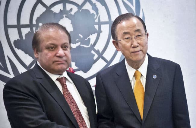 इससे पहले नवाज शरीफ ने संयुक्त राष्ट्र प्रमुख बान की मून के साथ भेंट के दौरान भी कश्मीर मुद्दा उठाया. पाकिस्तान के विदेश मंत्रलय के मुताबिक दोनों नेता न्यूयॉर्कमें संयुक्त राष्ट्र मुख्यालय में मिले और इस दौरान भारत द्वारा विदेश सचिव स्तर वार्ता भारत द्वारा रद्द किये जाने पर निराशा प्रकट की क्योंकि यह वार्ता प्रक्रि या के लिए एक झटका था. उल्लेखनीय है कि अगस्त में भारत ने कश्मीरी अलगाववादी नेताओं से पाकिस्तानी उच्चायुक्त के भेंट करने को लेकर वार्ता रद्द कर दी थी.