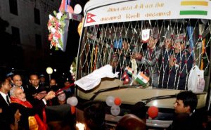 काठमांडो: भारतीय प्रधानमंत्री नरेंद्र मोदी और नेपाल के प्रधानमंत्री सुशील कोइराला ने आज यहां से काठमांडो-दिल्ली बस सेवा को हरी झंडी दिखाई जिसे पशुपतिनाथ एक्सप्रेस नाम दिया गया है. बस को हरी झंडी दिखाने से पहले दोनों प्रधानमंत्री बस में चढे और यात्रियों से बातचीत की. बस को फूलों, गुब्बारों आदि से सजाया गया था. बस काठमांडो, भैरावा, सोनौली, गोरखपुर, लखनऊ से होते हुए नयी दिल्ली जाएगी.
