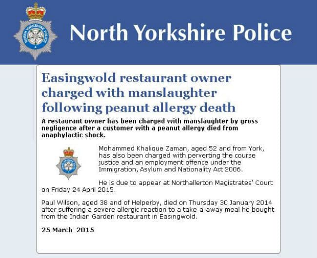 नार्थ यॉर्कशायर पुलिस विभाग ने अपनी वेबसाईट पर इस घटना की पुष्टि करते हुए लिखा है कि उक्त व्यक्ति को भोजन में मूंगफली खिलाने की वजह से हुई मौत का आरोपी माना गया है. गौरतलब है कि पश्चिमी देशों में पीनट (मूंगफली) से बहुत सारे लोगों को एलर्जी होती है और ऐसे में उनके भोजन में मूंगफली होने से गंभीर समस्याएं हो जाती हैं.