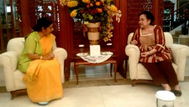 सुषमा ने भारत की पुरानी मित्र 68 वर्षीय मेगावती से मुलाकात की और दोनों देशों के बीच संबंधों को मजबूत करने के प्रयासों पर चर्चा की. चर्चा के दौरान मेगावती ने बताया कि किस तरह ओडिशा के पूर्व मुख्यमंत्री बीजू पटनायक ने उन्हें मेगावती नाम दिया था.