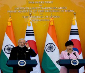 कोरियायी निवेशकों को आकर्षित करने के मिशन के साथ यहां आए प्रधानमंत्री नरेंद्र मोदी ने दक्षिण कोरिया की राष्ट्रपति पार्क ग्यून-ह्ये ने विभिन्न मुद्दों पर व्यापक चर्चा की. सोल में राष्ट्रपति भवन में हुई इस बातचीत में दोनों नेताओं ने आपसी संबंधों में नये तत्व, गति और नयेविषय वस्तुओं को जोड कर इसे गुणत्वमक रूपसे नये स्तरों पर ले जाने का संकल्प किया. इन तत्वों और विषयों में रक्षा, व्यापार, निवेश व क्षेत्रीय सहयोग से जुडे विषय शामिल होंगे. राष्ट्रपति पार्क के साथ संयुक्त संवाददाता सम्मेलन को संबोधित करते हुए मोदी ने कहा कोरिया की तेज प्रगति ने इस सदी के एशियाई सदी होने के विचार को मजबूत किया है.