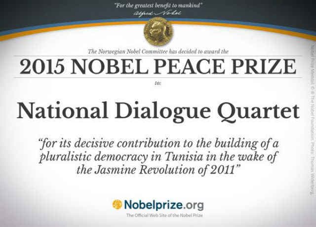 इसमें कहा गया है, ‘‘नार्वे नोबेल समिति उम्मीद करती है कि इस वर्ष का पुरस्कार ट्यूनीशिया में लोकतंत्र की रक्षा करने में सहायक होगा और यह उन सभी के लिए प्रेरक होगा जो पश्चिम एशिया , उत्तर अफ्रीका और विश्व के बाकी हिस्सों में शांति और लोकतंत्र को प्रोत्साहित करना चाहते हैं.’ क्वार्टेट में उत्तर अफ्रीकी देश के चार प्रमुख संगठन शामिल हैं जिसमें द ट्यूनीशियन जनरल लेबर यूनियन, द ट्यूनीशियन कंफेडरेशन आफ इंडस्टरी, ट्रेड एंड हैंडीक्राफ्ट्स, द ट्यूनीशियन ह्यूमन राइट्स लीग और द ट्यूनीशियन आर्डर आफ लायर्स शामिल हैं.