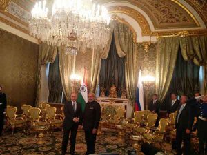 दो दिवसीय यात्रा पर यहां पहुंचे मोदी ने 16वें भारत..रूस शिखर सम्मेलन के दौरान क्रेमलिन में रूसी राष्ट्रपति पुतिन के साथ बिना सीधे बातचीत की. इस बैठक के बाद दोनों पक्षों के शिष्टमंडल इस वार्ता में शामिल हुए. दोनों पक्षों ने क्रेमलिन में दोपहर के भोज के दौरान भी चर्चा जारी रखी. मोदी ने कहा, ‘‘ भारत और रूस के बीच सांस्कृतिक संबंधों का लम्बा इतिहास है. और रूस के रुप में राजनीतिक और अंतरराष्ट्रीय स्तर पर हमारे साथ एक मजबूत और भरोसेमंद मित्र है. रूस कठिनाई के समय हमेशा हमारे साथ खडा रहा है. हमारे बीच सामरिक भागीदारी है और यह सही अर्थो में सामरिक संबंध हैं.