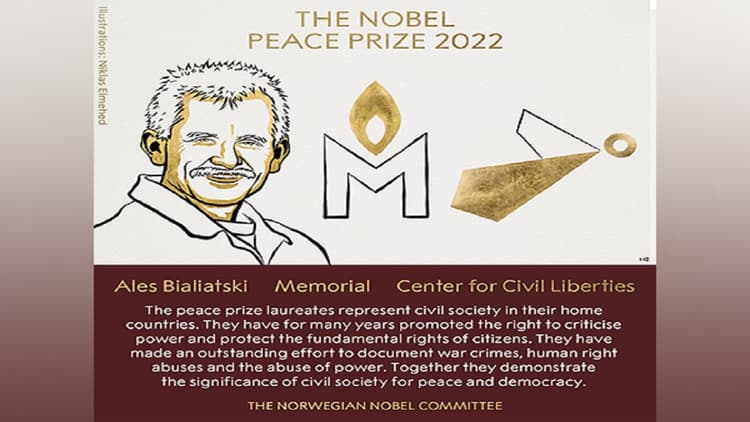 Nobel Prize 2022: इस वर्ष शांति के लिए नोबेल पुरस्कार मानवाधिकार कार्यकर्ता एलेस बियालियात्स्की, रूसी मानवाधिकार संगठन मेमोरियल और यूक्रेन के मानवाधिकार संगठन सेंटर फॉर सिविल लिबर्टीज को संयुक्त रूप से दिया गया है. इन शांति पुरस्कार विजेताओं ने युद्ध अपराधों, मानवाधिकारों के हनन और सत्ता के दुरुपयोग का दस्तावेजीकरण किया. इसके साथ ही शांति व लोकतंत्र की स्थापना के लिए नागरिक समाज के महत्व पर जोर दिया.