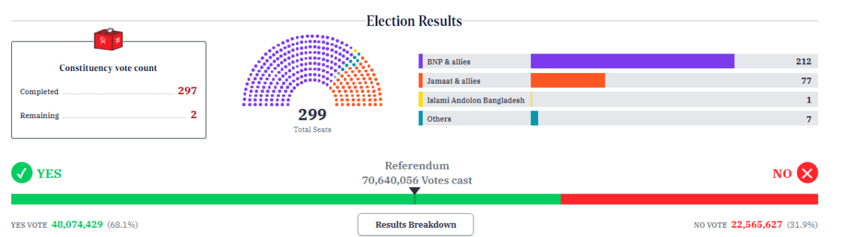12 फरवरी को हुए चुनाव में मतदाताओं ने पहली बार दो वोट डाले. एक नई सरकार चुनने के लिए और दूसरा ‘जुलाई चार्टर’ नामक जनमत-संग्रह के लिए. जनमत-संग्रह के नतीजों में भारी बहुमत से ‘हाँ’ के पक्ष में फैसला आया. इससे संकेत मिलता है कि बांग्लादेश की जनता संविधान में संशोधन चाहती है. चुनाव आयोग के अनुसार, कुल मतदान लगभग 59.44 प्रतिशत रहा.