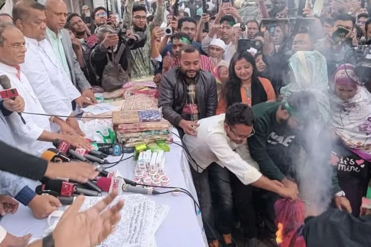 बांग्लादेश नेशनलिस्ट पार्टी के नेता रिजवी ने मौके पर मौजूद भीड़ से भारतीय उत्पादों के बहिष्कार की अपील की है. उन्होंने यह भी कहा कि भारतीयों ने बांग्लादेश के झंडे का अपमान किया है. इसका जवाब हम भारतीयों को उनके उत्पादों के बहिष्कार से देंगे. उन्होने कहा कि हम किसी भी कीमत पर झुकेंगे नहीं. हमलोग वक्त की खाना नहीं खाएंगे, लेकिन हम नहीं झुकेंगे. मीडिया रिपोर्ट के मुताबिक रिजवी ने अपनी पत्नी की भारतीय साड़ी जलाकर विरोध प्रदर्शन की शुरुआत की.