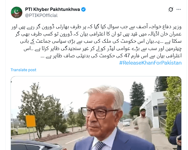PTI Khyber Pakhtunkhwa @PTIKPOfficial से यह वीडियो जारी किया गया है. इसमें कहा गया है कि रक्षा मंत्री ख्वाजा आसिफ का बयान देश की सबसे बड़ी राजनीतिक पार्टी के संस्थापक अध्यक्ष और सबसे बड़े जननेता के प्रति इस सरकार की गंभीरता की कमी को दर्शाता है. यह कबूलनामा सरकार की दुर्भावना को स्पष्ट रूप से दर्शाता है.