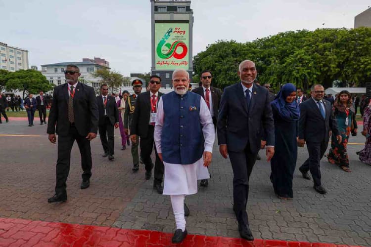 प्रधानमंत्री नरेंद्र मोदी शनिवार को मालदीव के स्वतंत्रता दिवस समारोह में मुख्य अतिथि के रूप में शामिल होते नजर आए. यह दोनों देशों के बीच द्विपक्षीय संबंधों में सुधार का एक सकारात्मक संकेत माना जा रहा है. मालदीव की राजधानी माले के रिपब्लिक स्क्वायर में आयोजित समारोह में राष्ट्रपति मोहम्मद मुइज्जू और उनके मंत्रिमंडल के वरिष्ठ मंत्रियों ने प्रधानमंत्री मोदी का जोरदार स्वागत किया जिसकी तस्वीरें भी सामने आईं.