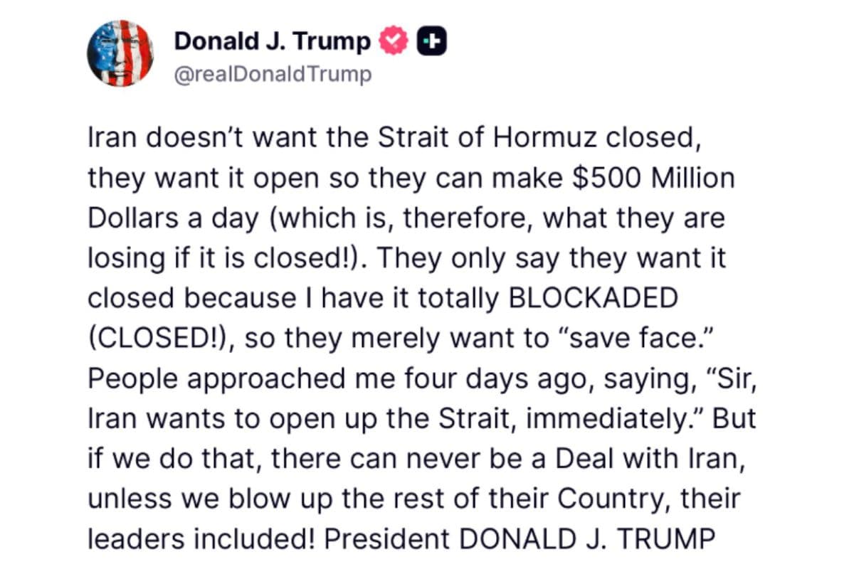 ट्रंप ने अपनी पोस्ट में कहा कि ईरान की तरफ से रास्ता बंद रखने की धमकियां सिर्फ राजनीतिक दिखावा हैं. उन्होंने दावा किया कि अमेरिका की मिलिट्री प्रेशर और पूरी तरह की गई नाकेबंदी की वजह से ईरान अपनी साख बचाने के लिए ऐसी बयानबाजी कर रहा है. ट्रंप ने यह भी खुलासा किया कि चार दिन पहले कुछ लोगों ने उनसे संपर्क कर बताया था कि ईरान तुरंत ‘स्ट्रेट ऑफ होर्मुज’ को खोलना चाहता है.