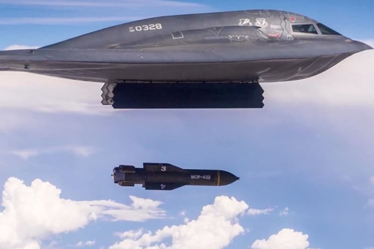 B-2 अमेरिकी वायुसेना का एक बेहद उन्नत और आधुनिक बमवर्षक विमान है. यह विमान विशेष रूप से गहराई में छिपे सैन्य ठिकानों को निशाना बनाने के लिए डिजाइन किया गया है. यह एक बार में दो GBU-57 Massive Ordnance Penetrator (MOP) बम ले जा सकता है, जिनका वजन 30,000 पाउंड यानी लगभग 13.5 टन होता है.