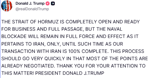 अमेरिकी राष्ट्रपति डोनाल्ड ट्रंप ने कहा कि ईरान के खिलाफ नौसैनिक नाकेबंदी तब तक पूरी ताकत से जारी रहेगी जब तक तेहरान युद्ध समाप्त करने के लिए अमेरिका के साथ किसी समझौते पर नहीं पहुंच जाता. उन्होंने कहा कि होर्मुज पूरी तरह से खुला है और व्यापार और आवागमन के लिए तैयार है, लेकिन ईरान के संबंध में नौसैनिक नाकेबंदी तब तक पूरी तरह से लागू रहेगी जब तक ईरान के साथ हमारा समझौता शत प्रतिशत पूरा नहीं हो जाता. उन्होंने उम्मीद जताई कि यह प्रक्रिया बहुत तेजी से आगे बढ़नी चाहिए क्योंकि अधिकांश बिंदुओं पर पहले ही बातचीत हो चुकी है.