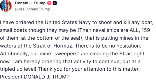 ट्रंप ने अपने पोस्ट में लिखा- मैंने अमेरिकी नौसेना को होर्मुज जलडमरूमध्य के जल में बारूदी सुरंगें बिछाने वाले किसी भी जहाज, चाहे वह छोटा ही क्यों न हो (उनके सभी 159 नौसैनिक जहाज समुद्र में डूब चुके हैं!), को गोली मारकर नष्ट करने का आदेश दिया है. इसमें जरा भी संकोच नहीं होना चाहिए.
