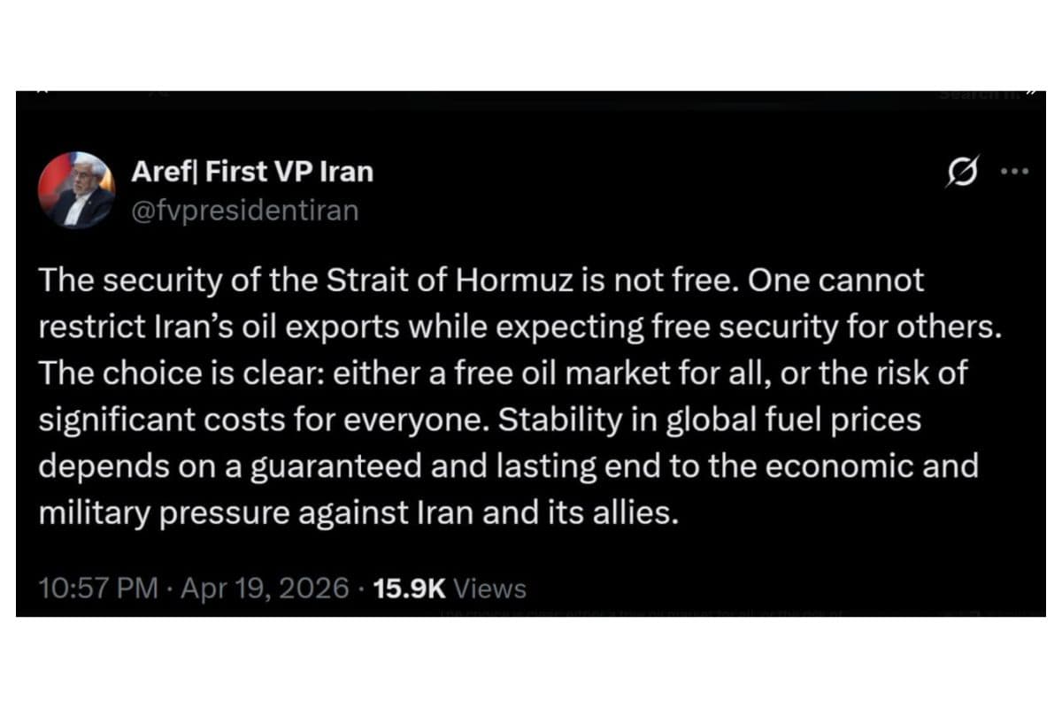 Iran-US Tensions: ईरान के उप राष्ट्रपति मोहम्मद रजा आरिफ ने अमेरिका के साथ बढ़ते तनाव के बीच बड़ी चेतावनी दी है. उन्होंने रविवार को सोशल मीडिया प्लेटफॉर्म एक्स पर कहा कि होर्मुज जलडमरूमध्य (स्ट्रेट ऑफ होर्मुज) की सुरक्षा मुफ्त में नहीं मिलने वाली है. आरिफ के मुताबिक, दुनिया यह उम्मीद नहीं कर सकती कि एक तरफ ईरान के तेल एक्सपोर्ट पर पाबंदियां लगाई जाएं और दूसरी तरफ ईरान सबकी समुद्री सुरक्षा की गारंटी देता रहे. उन्होंने साफ कर दिया कि अगर ईरान पर दबाव जारी रहा, तो इसका असर पूरी दुनिया के एनर्जी मार्केट पर पड़ेगा.