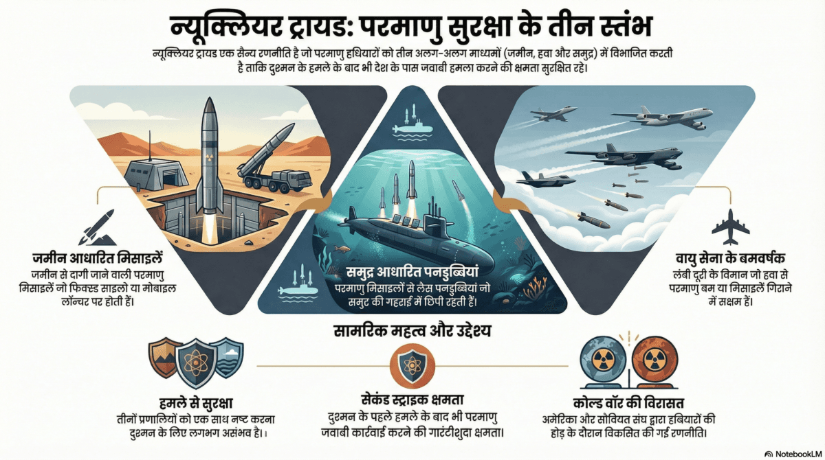 न्यूक्लियर ट्रायड (Nuclear Triad) का मतलब है किसी देश की परमाणु ताकत को तीन अलग-अलग तरीकों में बांटना. इसमें जमीन से दागी जाने वाली परमाणु मिसाइलें, समुद्र में तैनात परमाणु मिसाइलों से लैस पनडुब्बियां और हवा से हमला करने वाले परमाणु बमवर्षक विमान शामिल होते हैं. सरल शब्दों में कहें तो यह जमीन, समुद्र और हवा से परमाणु हमला करने की क्षमता.