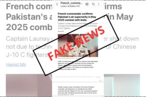 पाकिस्तान के टीवी चैनल जीयो टीवी और उसके पत्रकार हामिद मीर ने दावा किया कि फ्रांस के एक नौसेना अधिकारी ने माना है कि भारत का राफेल फाइटर जेट पाकिस्तान के सामने कमजोर साबित हुआ और पाकिस्तान के पायलटों ने भारतीय राफेल को मार गिराया. इस पर फ्रांस की नौसेना, जिसे French Navy या Marine Nationale कहा जाता है, ने सोशल मीडिया प्लेटफॉर्म X पर सख्त बयान जारी किया और लिखा कि ये खबर पूरी तरह फेक न्यूज, गलत जानकारी और लोगों को गुमराह करने वाली है. उन्होंने साफ कहा कि ये बातें उनके किसी अधिकारी ने नहीं कही हैं.
