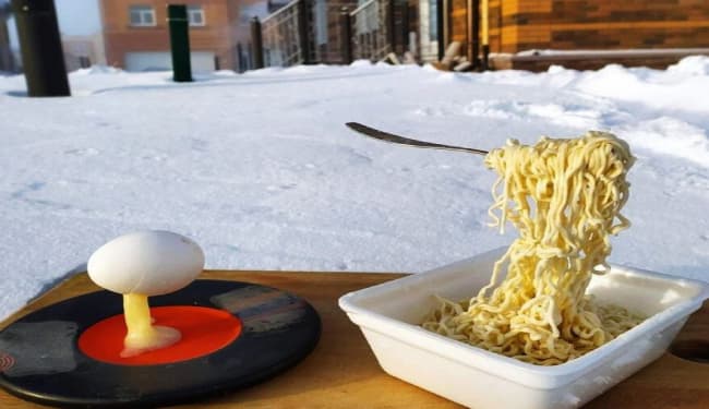 साइबेरिया के नोवोसिबिर्स्क शहर के यूजर ने तस्वीर को सोशल मीडिया में साझा किया है. तस्वीर के साथ उन्होंने लिखा है कि यह उससमय ली गयी है, जब तापमान शून्य से 45 डिग्री सेल्सियस नीचे था. अंडे और नूडल्स के अंदर का तरल जम गया है.