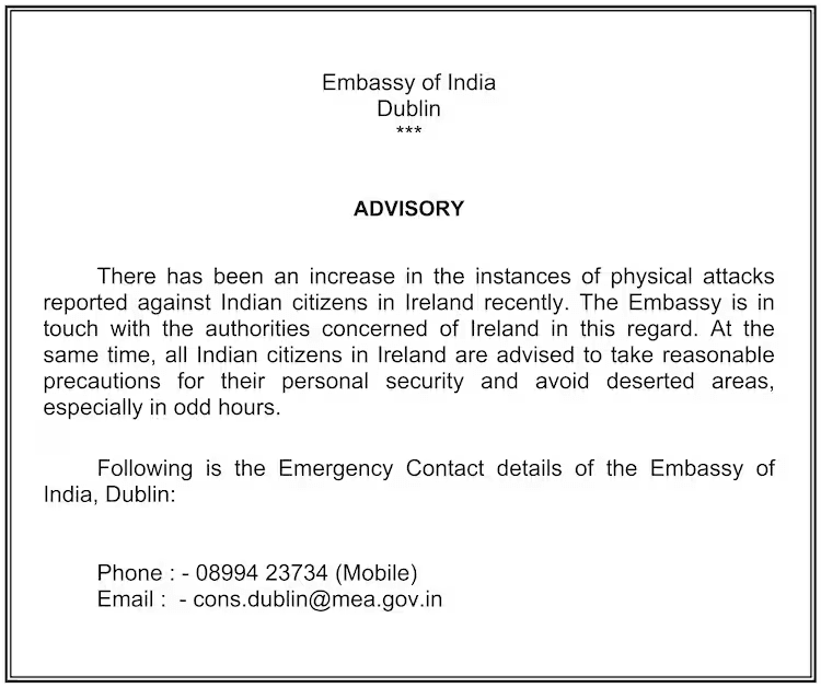 भारतीय दूतावास ने अपने परामर्श में कहा कि आयरलैंड में हाल ही में भारतीय नागरिकों पर शारीरिक हमलों की घटनाएं बढ़ी हैं. इस संबंध में दूतावास संबंधित आयरिश अधिकारियों के संपर्क में है. दूतावास ने भारतीय नागरिकों को सलाह दी है कि वे व्यक्तिगत सुरक्षा के लिए सतर्क रहें, खासकर रात के समय और सुनसान इलाकों में अकेले न जाएं. इसके साथ ही दूतावास ने आपातकालीन सहायता के लिए एक संपर्क नंबर (08994 23734) और ईमेल आईडी (cons.dublin@mea.gov.in) भी साझा किया है.