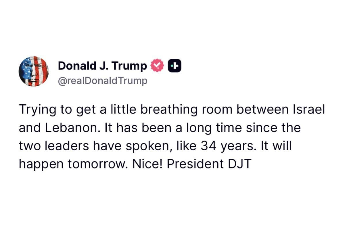 ट्रंप की 'ट्रुथ सोशल' पोस्ट: इजरायल-लेबनान के बीच 34 साल बाद कल होगी ऐतिहासिक बातचीत
