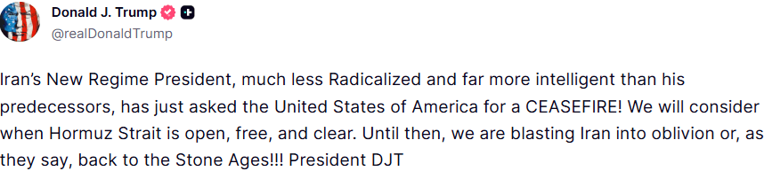 अमेरिकी राष्ट्रपति ने यह भी कहा कि सीजफायर की उन्होंने शर्त रखी है. उनकी शर्त के मुताबिक, युद्धविराम तभी होगा, जब होर्मुज खुला, सुरक्षित और बाधारहित होगा. उन्होंने कहा कि अगर उन्हें विश्वास हो जाता है कि ईरान परमाणु हथियार नहीं बना पाएगा, तो वह दो से तीन सप्ताह में युद्ध से पीछे हट सकते हैं. भले ही तेहरान युद्धविराम के लिए सहमत न हो. उन्होंने लिखा कि तब तक हम ईरान को पूरी तरह तबाह कर रहे हैं, या जैसा लोग कहते हैं, उसे वापस पाषाण युग में भेज रहे हैं.