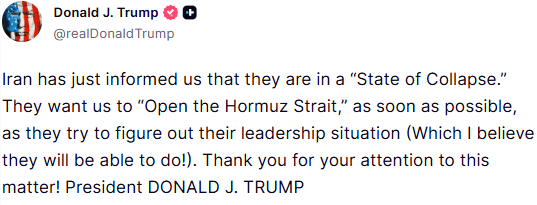 राष्ट्रपति ट्रंप ने अपने सोशल मीडिया प्लेटफॉर्म ट्रुथ सोशल पर लिखा कि ईरान ने हाल ही में अमेरिका को बताया है कि वह पूरी तरह से टूटने की स्थिति में पहुंच गया है. उन्होंने कहा कि ईरान चाहता है कि होर्मुज जलडमरूमध्य को जल्द खोला जाए, ताकि वह अपने नेतृत्व की स्थिति को संभाल सके.