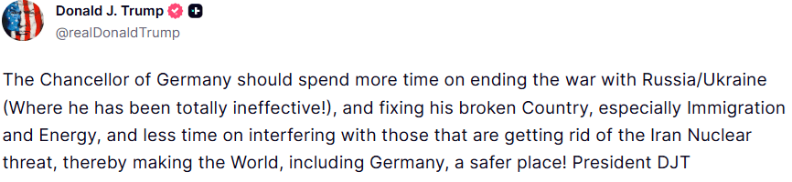 ट्रंप ने अपने एक सोशल मीडिया पोस्ट में कहा कि फ्रेडरिक मर्ज को रूस-यूक्रेन को युद्ध समाप्त कराने और अपने टूटे हुए देश को ठीक करने (खास तौर पर आव्रजन और ऊर्जा के मामले) पर ज्यादा ध्यान देना चाहिए. ईरान युद्ध के बारे में सोचने में कम समय खर्च करना चाहिए.