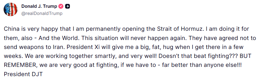 ट्रंप ने अपने पोस्ट में कहा- होर्मुज स्ट्रेट को स्थायी रूप से खोलने से चीन बहुत खुश है. अपनी आगामी चीन यात्रा का जिक्र करते हुए ट्रंप ने कहा- कुछ हफ्तों में जब मैं वहां पहुंचूंगा तो राष्ट्रपति शी मुझे गले लगाएंगे. हम मिलकर समझदारी से और बहुत अच्छे से काम कर रहे हैं! क्या यह लड़ाई से बेहतर नहीं है?” इस दौरान ट्रंप ने चेतावनी भी दी कि लेकिन याद रखें कि अगर जरूरत पड़ी तो हम लड़ने में बहुत माहिर हैं… और किसी औरों से कहीं बेहतर.