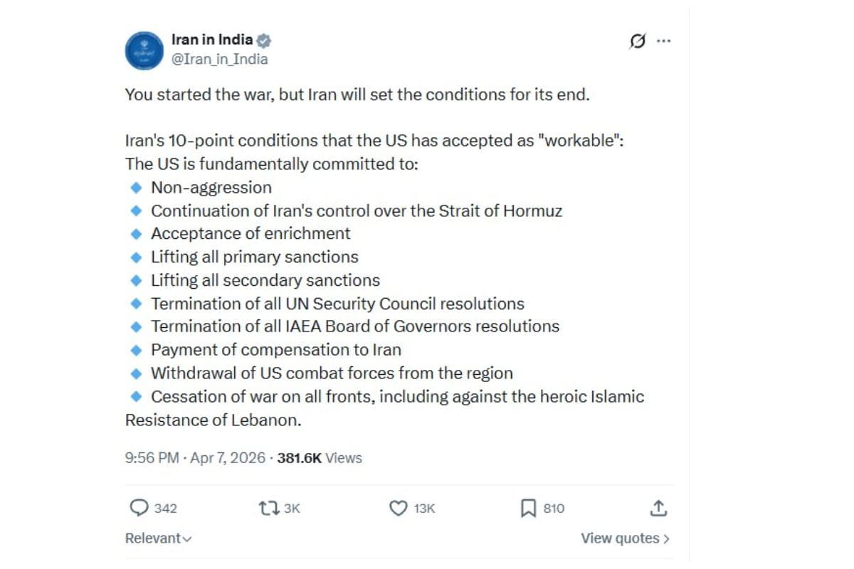 ईरान ने शांति के लिए 10 शर्तें रखी हैं, जिन्हें राष्ट्रपति ट्रंप ने ‘काम करने लायक’ बताया है. ईरान की सोशल मीडिया पोस्ट के अनुसार, उनकी मुख्य मांगें ये हैं: